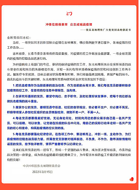大疫當(dāng)前,東北地理所黨委積極響應(yīng)上級(jí)黨組織號(hào)召,把黨的政治優(yōu)勢(shì)、組織優(yōu)勢(shì)和密切聯(lián)系群眾的優(yōu)良作風(fēng)轉(zhuǎn)化為疫情防控的強(qiáng)大力量。所黨委發(fā)起《沖鋒在前做表率 眾志成城戰(zhàn)疫情——致東北地理所廣大黨員同志的倡議書(shū)》,號(hào)召全體黨員要積極參加疫情防控工作,在各項(xiàng)防控工作中做模范、當(dāng)先鋒;把每個(gè)崗位都當(dāng)做抗擊疫情的戰(zhàn)斗堡壘;在各項(xiàng)工作中,要迎難而上、沖到一線、主動(dòng)作為,為打贏疫情防控阻擊戰(zhàn)貢獻(xiàn)力量。