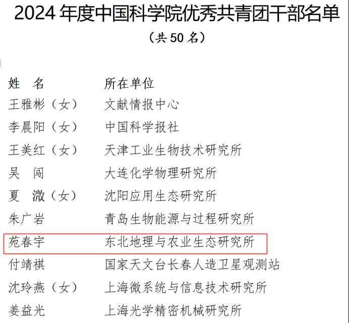 為表彰先進(jìn)、樹立典型,激勵團(tuán)青組織和廣大團(tuán)員、團(tuán)干部奮勇爭先、再創(chuàng)佳績。近日,中國科學(xué)院團(tuán)委發(fā)文對29個五四紅旗團(tuán)委、30個五四紅旗團(tuán)支部、50名優(yōu)秀共青團(tuán)干部、100名優(yōu)秀團(tuán)員青年進(jìn)行表彰。中國科學(xué)院東北地理與農(nóng)業(yè)生態(tài)研究所團(tuán)委書記苑春宇榮獲“2024年度優(yōu)秀共青團(tuán)干部”稱號、2023級博士研究生常瀟榮獲“2024年度中國科學(xué)院優(yōu)秀共青團(tuán)員”稱號。
