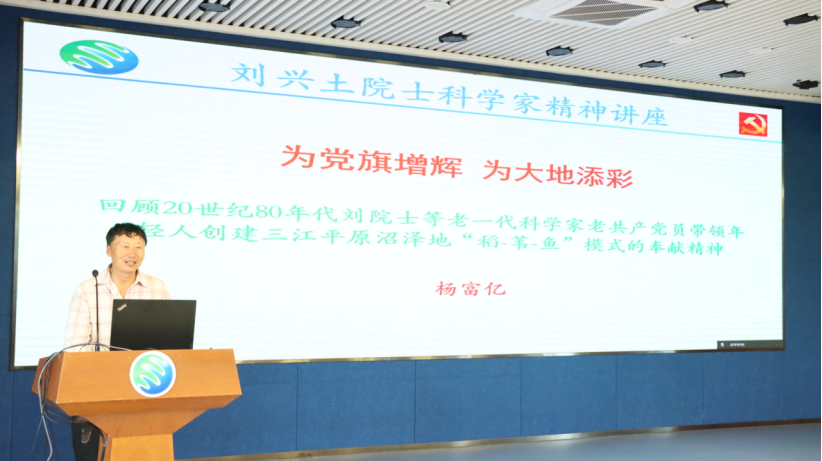 在劉興土院士科學家精神講座環節,特邀楊富億研究員以《為黨旗增輝 為大地添彩》為題作報告。他以“稻-葦-魚”模式創建過程為線索,講述劉興土院士等老一輩科學家、老黨員帶領一批年輕人創建“稻-葦-魚”模式的故事,分享身邊人的感人故事,講述一個個鮮活的事例,展現了科研工作者腳踏實地、無私奉獻的偉大精神,全所職工、研究生備受鼓舞。