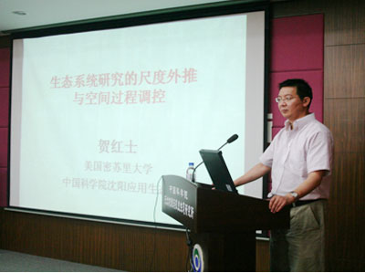 賀紅士研究員做了題為《生態(tài)系統(tǒng)研究的尺度外推與空間過(guò)程調(diào)控》的研究報(bào)告,他從“樣點(diǎn)尺度上的結(jié)果能代表多大空間或能外推到多大空間”和“某一時(shí)間上的觀測(cè)結(jié)果能在多長(zhǎng)的時(shí)間尺度上有效”兩個(gè)科學(xué)問(wèn)題開(kāi)始,對(duì)生態(tài)系統(tǒng)研究尺度外推的主要前沿問(wèn)題:空間異質(zhì)性、模擬預(yù)測(cè)、多尺度融合進(jìn)行了詳細(xì)闡述,同時(shí)對(duì)其團(tuán)隊(duì)研究開(kāi)發(fā)的LANDIS模型及其在我國(guó)小興安嶺森林火災(zāi)預(yù)測(cè)中取得的一些成果給大家進(jìn)行了展示并進(jìn)行了深入探討。