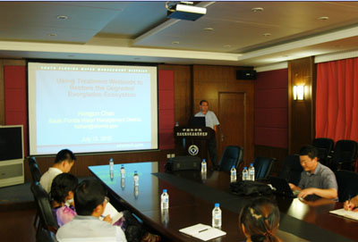 陳竑竣博士做了題為《Using Treatment Wetlands to Restore the Degraded Everglades Ecosystem》的精彩報告,整個報告對濕地生態(tài)系統(tǒng)恢復(fù),Everglades大沼澤面臨的主要問題,Everglades大沼澤的恢復(fù),雨水處理區(qū),營養(yǎng)物質(zhì)去除機制,處理區(qū)的有效性,雨水處理區(qū)營養(yǎng)物質(zhì)去除對下游沼澤水質(zhì)的影響等進(jìn)行了深入探討。科研處及濕地生態(tài)與環(huán)境研究中心科研人員和研究生共20余人參加了會議。