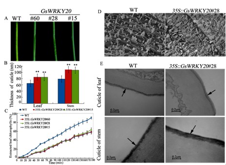 掃描電鏡與透射電鏡顯示GsWRKY20促進蠟質晶體合成,形成更厚角質層