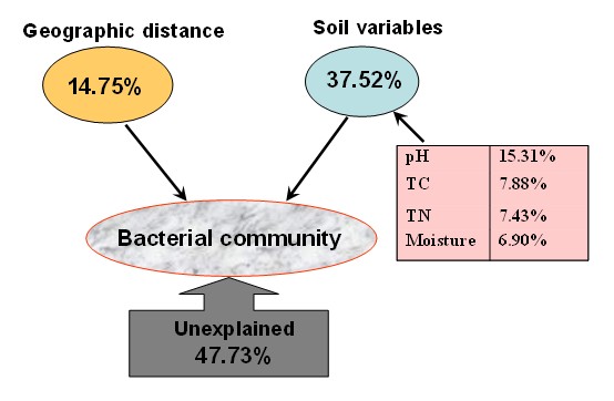 動植物在陸地生態系統中存在一定的地理分異規律。與動植物相比,對于陸地生態系統中數量巨大、種類多樣的土壤微生物而言,是否存在生物地理分布格局及其驅動因素是什么?是目前土壤學和微生物生態學研究的前沿科學問題。已有的研究結果表明,不同生態系統中的土壤微生物受到生物和非生物因素的雙重影響,群落結構多樣性及群落結構組成存在較大差異。在這些影響因素中土壤pH被普遍認為是制約土壤細菌群落結構變化的主要因素。值得指出的是,多數研究均是基于土壤pH值差異較大的不同原始土壤進行的,而對于同一種土壤類型,土壤pH值變化較小而其它土壤理化性質差異較大時,決定土壤微生物生物地理分布的因素是什么是一個值得探討的科學問題。