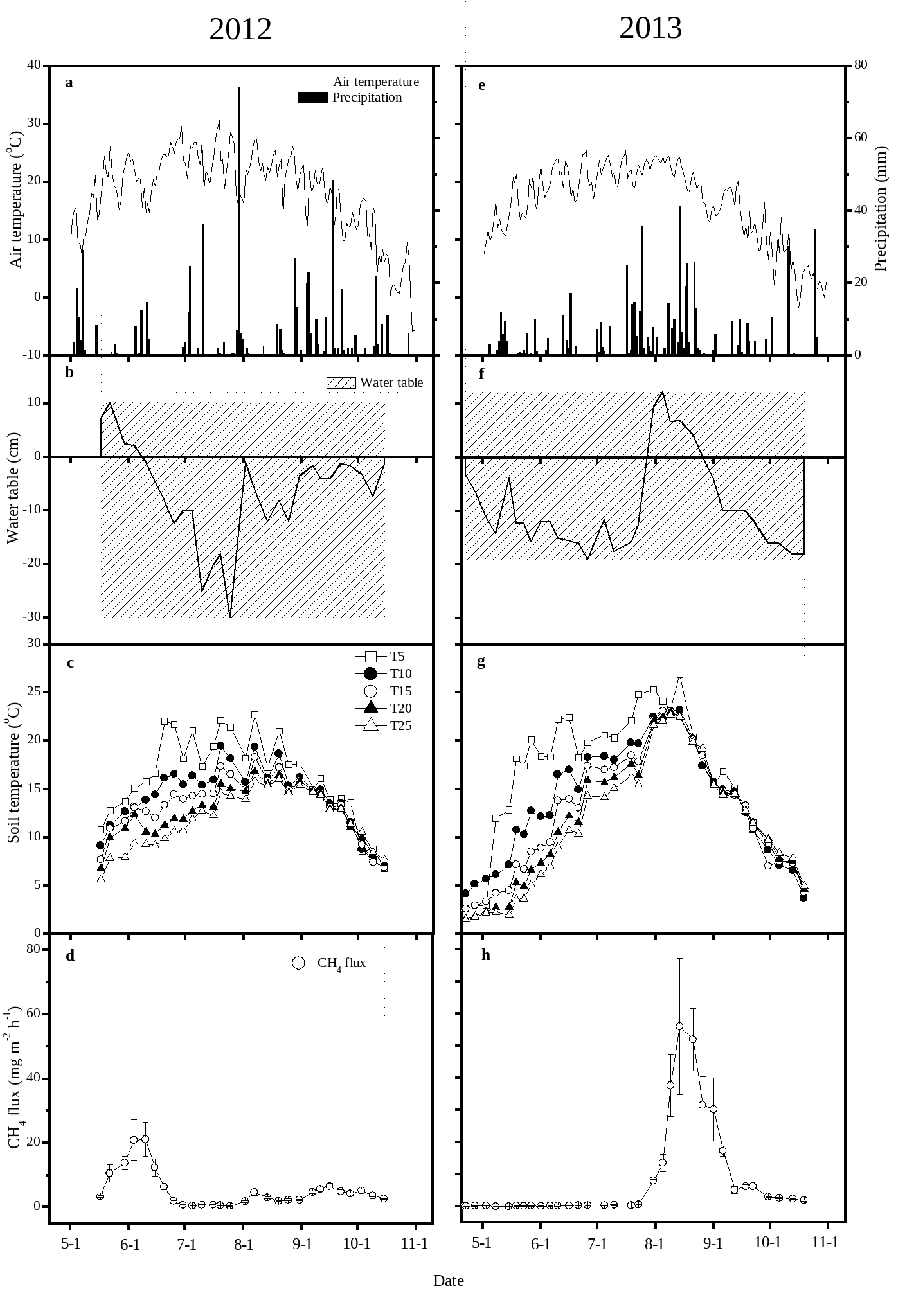圖 2012和2013年植物生長季氣溫和降水(a和e)、水位(b和f)、5, 10, 15, 20和25cm土壤溫度(c和g)以及CH4排放通量(d和h)變化動(dòng)態(tài)