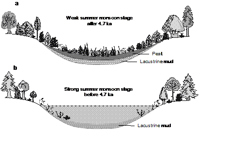 針對這一科學問題,我所濕地演化與生態功能學科組以三江平原天然沼澤濕地為研究對象,進行了系統的野外調查、泥炭柱芯采集和實驗分析,并收集整理分析了已有資料。在此基礎上利用頻率統計方法確定了三江平原泥炭地發育的歷史過程。研究結果表明,盡管三江平原泥炭地的發育時期涵蓋了整個全新世,然而80%的沼澤濕地發育于4600 yrBP之后的全新世中晚期。根據沉積相的變化發現該地區沼澤濕地的大多是在淺湖消亡的基礎上發育而來的。已有的研究表明,三江平原氣候屬東亞季風控制的典型溫帶季風氣候,早中全新世是夏季風相對強盛的季風最大期,而4600 yrBP 恰處于東亞夏季風衰退的關鍵期。因此,通過綜合對比泥炭地發育頻率變化和東亞季風演化的規律,該研究認為三江平原泥炭地的發育主要受控于東亞夏季風強度的變化。在早中全新世東亞夏季風最大期,強盛的夏季風帶來充足的降水,使三江平原低洼地貌區域形成水位較深的淺湖環境。而4600 yrBP以后,隨著夏季風的減弱,早期的湖泊開始逐漸消亡,沼澤濕地在此基礎上開始發育。