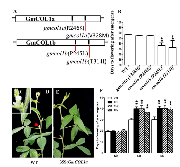 CONSTANS (CO) 在很多植物的光周期反應(yīng)機(jī)制中具有重要的角色。但是,目前尚未有關(guān)于CO在大豆開花期調(diào)控途徑的功能研究。為了填補(bǔ)這項(xiàng)空白,我們課題組克隆了大豆中的與擬南芥CO基因同源的兩個(gè)基因—GmCOL1a和GmCOL1b,并研究長(zhǎng)日照條件下,GmCOL1a和GmCOL1b對(duì)大豆光周期的影響。課題組的前期研究結(jié)果表明,長(zhǎng)日照條件下,大豆開花期主要受E1、E2、E3和E4的影響。本研究進(jìn)一步明確了這四個(gè)基因的調(diào)控關(guān)系,即在轉(zhuǎn)錄水平上,E3和E4促進(jìn)E1和E2的表達(dá),E1抑制E2的表達(dá),并且明確這四個(gè)基因?qū)?/span>GmCOL1a和GmCOL1b的表達(dá)起到促進(jìn)作用。GmCOL1a的過表達(dá)會(huì)延遲大豆的開花期,GmCOL1b突變后,開花期提前,即在長(zhǎng)日照條件下,GmCOL1a和GmCOL1b抑制大豆的開花期。其中,GmCOL1a通過抑制GmFT2a/5a的表達(dá)而抑制大豆的開花期。此外,我們研究還表明,GmCOL1a抑制E1和E2的表達(dá),反之亦然。因此,我們認(rèn)為,E1、E2和GmCOL1a形成負(fù)反饋調(diào)節(jié)環(huán)。綜上,GmCOL1a和GmCOL1b在長(zhǎng)日照條件下,抑制大豆的開花期,進(jìn)一步完善了大豆光周期的調(diào)控網(wǎng)絡(luò)。