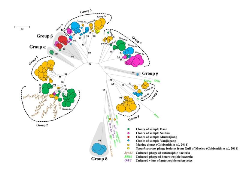 圖:稻田藍藻病毒phoH基因序列與來自海洋環境phoH基因克隆序列,來自聚球藻噬菌體、可培養的自養細菌噬菌體、異養細菌噬菌體、自養真核生物病毒的phoH基因序列構建的系統進化樹