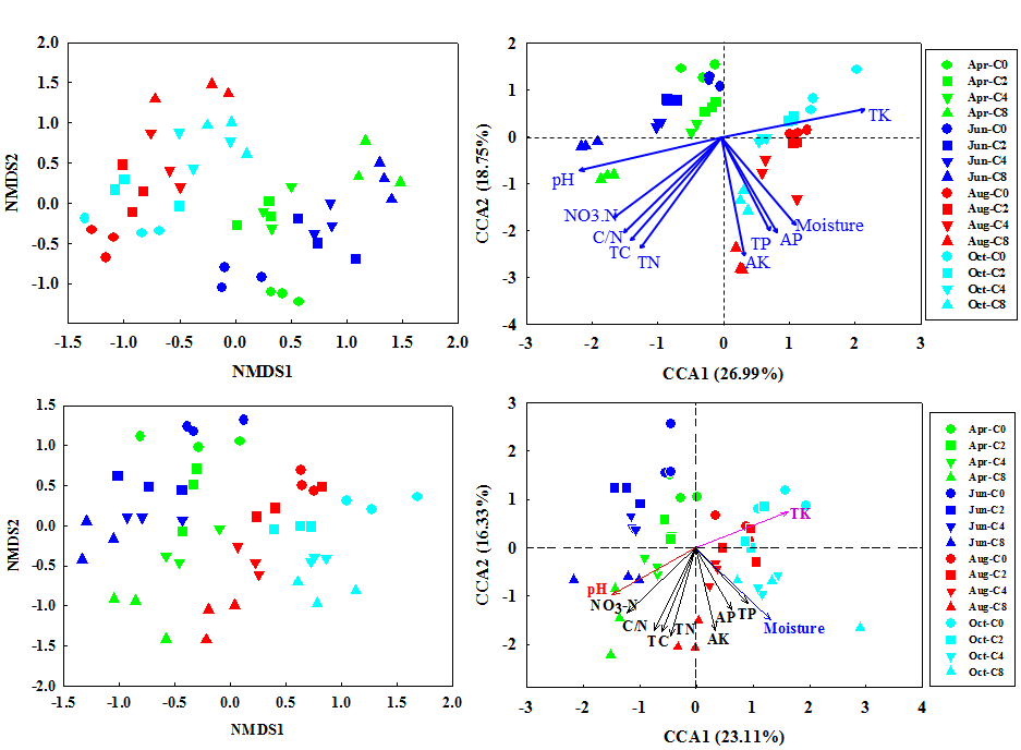 圖1生物炭施用對(duì)黑土細(xì)菌群落(A、B)和真菌群落結(jié)構(gòu)(C、D)的NMDS和CCA分析