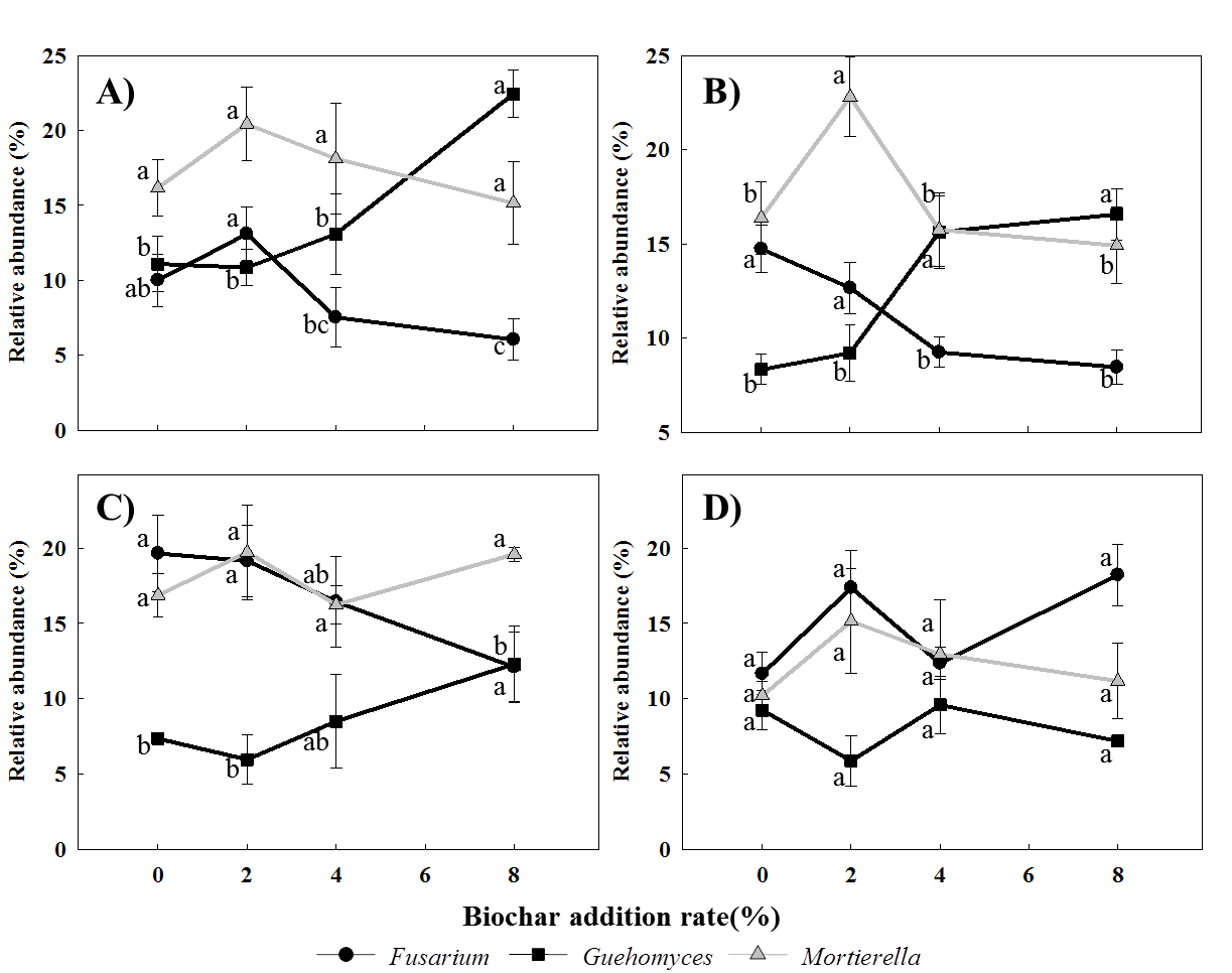 圖2 不同添加量生物炭對(duì)優(yōu)勢(shì)真菌屬相對(duì)豐度的影響。A、B、C和D分別是采集的4月、6月、8月和10月的土壤樣品。