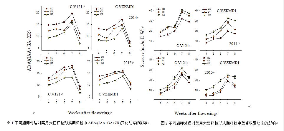 為此,在國家自然科學基金(41471241)和黑龍江省重點基金(ZD201307)的資助下,中國科學院東北地理與農業生態研究所大豆分子育種學科組張秋英研究員、劉長鍇博士研究生及涂冰潔碩士研究生等從鉀素調控菜用大豆籽粒蔗糖代謝關鍵酶活性及植物內源激素信號變化角度出發,探究了不同施鉀處理條件下,菜用大豆籽粒中蔗糖代謝關鍵酶活性及內源激素變化與籽粒蔗糖積累間的關系。研究發現施鉀后籽粒中蔗糖合成方向酶活性增強,分解方向酶活性變化較小,這對于維持庫器官中較高水平的蔗糖含量具有重要作用;同時,施鉀增加了菜用大豆籽粒中IAA、GA、ZR的含量,降低了ABA的含量,并且籽粒中ABA的含量與籽粒中蔗糖積累量呈極顯著負相關,初次發現籽粒中ABA/(IAA+GA+ZR)的變化動態與籽粒中蔗糖變化動態一致(圖1,圖2),表明鉀素可通過影響內源激素之間的平衡,進而促進籽粒中蔗糖的累積,該發現可為激素調控蔗糖積累方面研究提供新思路,對于合理施用鉀肥,改善菜用大豆食用品質具有重要意義。