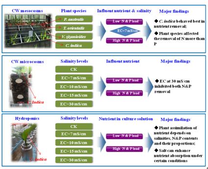 東北地理所水環(huán)境污染與防治學(xué)科組在對人工濕地處理含鹽廢水的國內(nèi)外研究進展進行綜述性研究的基礎(chǔ)上(Liang et al., Ecological Engineering,2017),開展了人工濕地處理不同類型含鹽廢水的研究工作。研究發(fā)現(xiàn),在栽種適宜的耐鹽植物后,人工濕地可以對含鹽廢水(EC≦15 dS/m)中的氮磷等營養(yǎng)元素達到較好的凈化效果;鹽度、污染負荷、濕地結(jié)構(gòu)、共存污染物等均在一定程度上影響人工濕地對氮磷的凈化能力;通過優(yōu)化濕地結(jié)構(gòu)等措施可以保障人工濕地較好的運行效果(Liang et al., Chemosphere, 2017)。