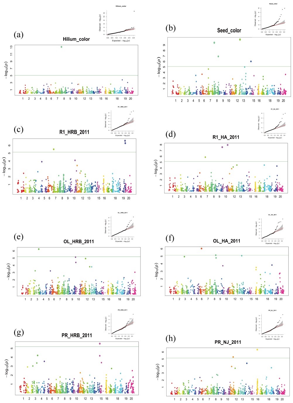 圖2.種臍顏色,種皮顏色,開花時(shí)間(R1),種子蛋白含量,油分含量的GWAS分析圖。