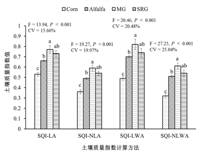 進一步的研究表明,松嫩堿化草地土壤質量評價的最小數據集中包括蔗糖酶活性、N:P、可溶性有機碳含量和不穩定有機碳含量 4個土壤指標。4個土壤質量指數均能準確的反應出土地利用方式對土壤質量的影響,但由于SQI-NLWA在不同土地利用方式間的差異更明顯,變異性更大,能更敏感的反映出土地管理措施的影響,因此更適合研究區內土壤質量的評價。苜蓿地、羊草地和自然恢復草地中土壤質量指數均較高,表明草地恢復顯著改善了研究區內的土壤質量。