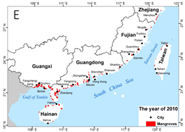 紅樹林是生長在熱帶、亞熱帶海岸潮間帶或河流入??诘哪颈局参锶郝?,具有防風消浪、保護灘涂、凈化海水和促淤造陸等重要作用,是國際上濕地生態保育和生物多樣性保護的重要對象。然而近半個世紀以來,人類活動和自然環境的變化導致紅樹林資源急劇減少,全球35%的紅樹林在此期間消失。紅樹林不可取代的生態、經濟、社會效益,以及面臨著自然和人為雙重脅迫下急劇銳減的嚴峻形勢,使得紅樹林保護和管理越來越受到世界各國的重視。在中國,上世紀后50年紅樹林遭到嚴重破壞,其損失速率顯著高于世界平均水平。自20世紀90年代中期開始,中國政府頒布了一系列紅樹林保護的法律和條例,但是關于紅樹林保護成效的研究甚少。特別是在國家尺度上,紅樹林保護的成效如何?各個保護區的建立是否起到了保護當地紅樹林的作用?等等相關問題還沒有明確的答案。這些問題的解答對于制定合理的濱海濕地保護、恢復和資源利用政策意義重大,對于建設“美麗中國”這一生態文明目標的相關工作也具有重要的借鑒意義。