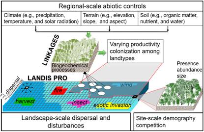 圖1.結(jié)合區(qū)域、景觀和林分尺度過程的樹種分布耦合模擬方法