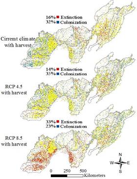研究發(fā)現(xiàn)大部分的北方、廣分布及少數(shù)南方樹種的分布面積將縮減,大部分的南方樹種的分布面積將擴(kuò)張;種群動(dòng)態(tài)是影響樹種分布變化最重要的過程;在短期和中期,采伐的作用比氣候變化的作用大,但在長期,氣候變化的作用比采伐的作用大,采伐和氣候變化有交互作用,采伐將加速由氣候變化導(dǎo)致的分布面積縮減(特別是北方樹種)和分布面積擴(kuò)張(特別是南方樹種);樹種生物屬性如繁殖能力、成熟時(shí)間、擴(kuò)散能力對(duì)未來樹種分布變化起到很重要的作用。該研究強(qiáng)調(diào)了在氣候變化下,種群動(dòng)態(tài)和采伐對(duì)提高未來樹種分布預(yù)測起到很重要的作用,在理論上把影響樹種分布的多尺度過程納入對(duì)氣候變化響應(yīng)的預(yù)測,完善了樹種分布預(yù)測的模型理論,提高了預(yù)測的真實(shí)性;在應(yīng)用上為資源管理和物種保護(hù)提供理論基礎(chǔ),也為制定適應(yīng)氣候變化的策略提供科學(xué)支撐。