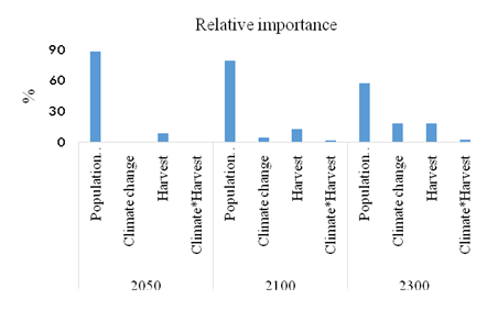 圖3.種群動(dòng)態(tài)、采伐、氣候變化及其交互作用對(duì)樹種(以white oak 為例)分布變化的相對(duì)貢獻(xiàn)