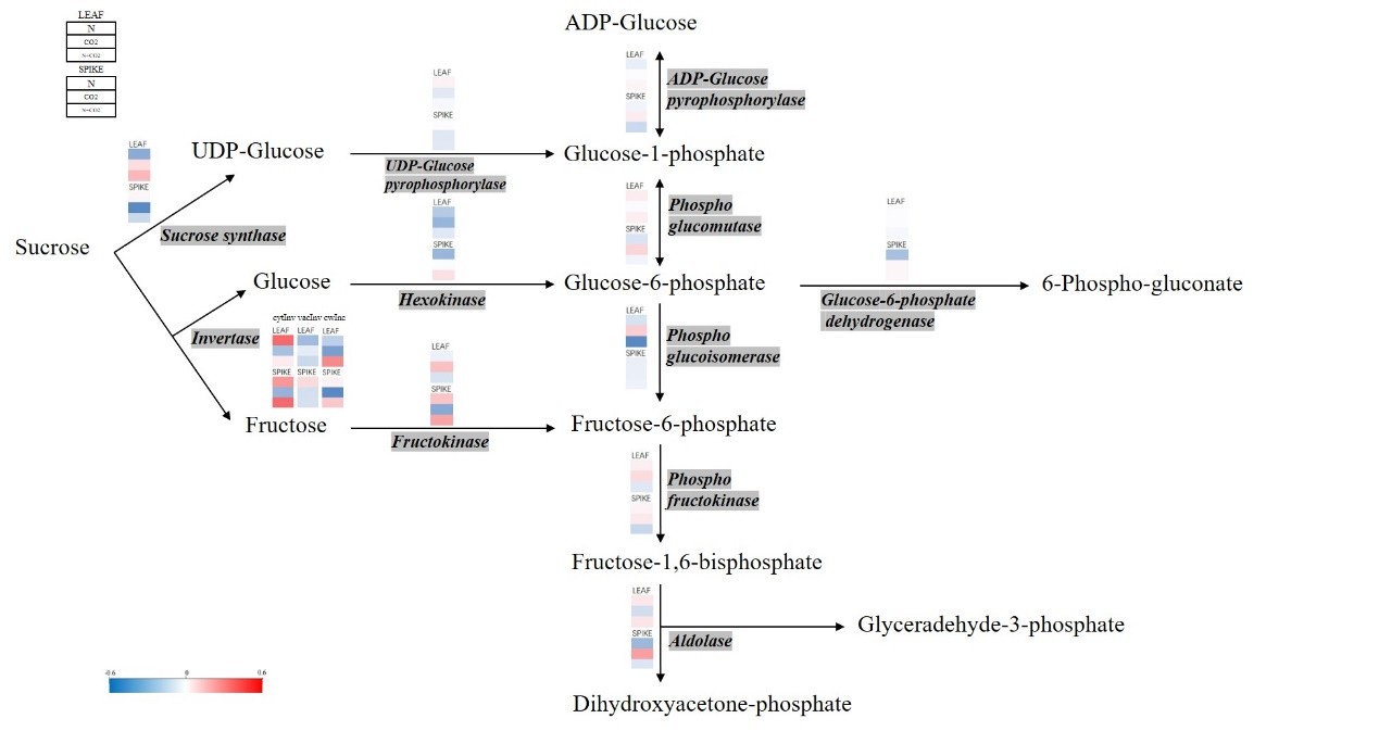 圖1 CO2增高與氮素供給對小麥源庫器官碳代謝通路的影響