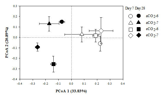 圖2正常CO2濃度(○)和CO2濃度升高(△)條件下大豆殘?bào)w在培養(yǎng)7天、14天、28天后土壤整體細(xì)菌群落結(jié)構(gòu)PCoA圖。