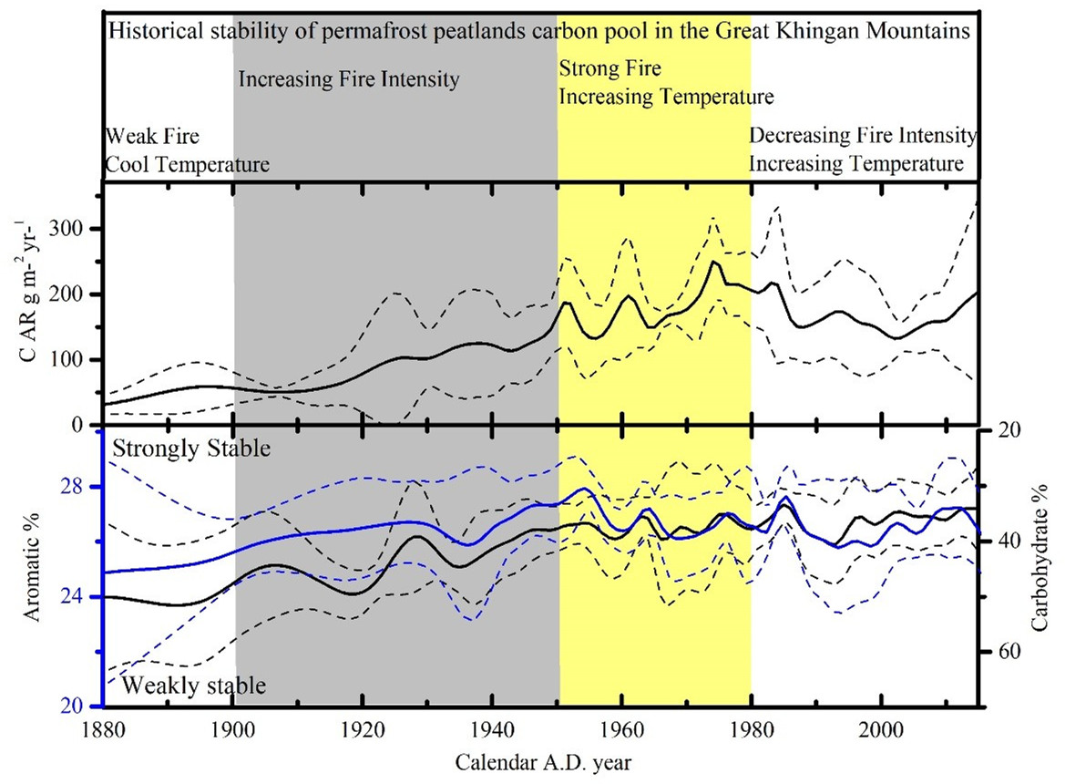 19世紀末以來,大興安嶺地區人類活動日益加劇,人類活動引起的野火頻發不僅促使泥炭沼澤植被的生長,提高碳累積速率;由于野火頻發促使表層土壤中易分解的有機物快速分解且產生含有芳香族結構的熱解碳,因此野火頻發也提高泥炭沼澤土壤碳庫中芳香族化合物的含量,進而增加土壤碳庫的穩定性。因此在1900-1980年間,野火頻發促使大興安嶺北部地區泥炭沼澤土壤碳庫的累積速率和穩定性均明顯增加。大興安嶺北部野火發生的頻率和強度在20世紀80年代以來開始明顯下降,泥炭沼澤土壤碳庫的累積速率和穩定性也隨之開始下降。氣候變化逐漸成為影響泥炭沼澤土壤碳庫的主要因素,從2000年至今,氣溫升高和降水減少導致大興安嶺地區北部泥炭沼澤土壤碳庫的累積速率和穩定性均出現增加的趨勢。本研究首次論述了近百年來氣候變化、野火頻發等環境擾動因素對泥炭沼澤土壤碳庫穩定性的影響,同時研究結果將為評估和預測未來全球變化對泥炭沼澤土壤碳庫的影響具有重要的意義。