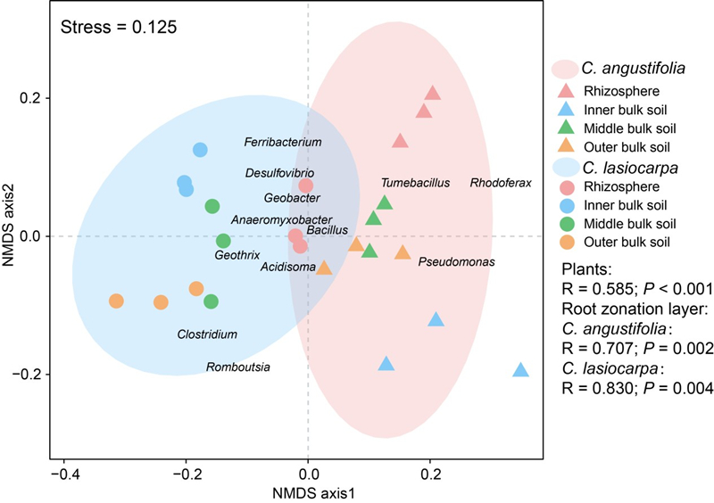 圖1 鐵還原菌在不同植物和根系分區的NMDS分析及相似度檢驗