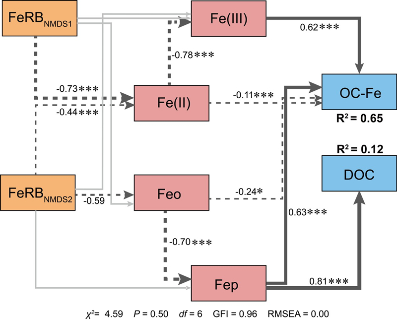 東北地理所科研人員以我國黑龍江省洪河自然保護區天然濕地中的小葉章和毛苔草為研究對象,采用根箱進行原位培養實驗,結果發現植物根系的存在影響了鐵氧化物的形態和含量,在植物根際由于根際沉積以及無定形鐵(Feo)的轉化導致了高含量的絡合鐵(Fep);由于根系泌氧作用導致在根際富集了Fe(III),而在非根際由于鐵異化還原的作用則富集了Fe(II);高通量測序發現鐵還原菌的相對豐度大約在2%~4%,并主要以地桿菌(Geobacter),厭氧粘細菌(Anaeromyxobacter,)、芽孢桿菌(Bacillus)和梭菌(Clostridium)為主;NMDS分析表明鐵還原菌在不同的植物和根箱分區之間都具有差異顯著;通過CCA分析還發現,Fe(II)和溶解性有機碳(DOC)是影響鐵還原菌的最主要的影響因子。在小葉章和毛苔草的根際,OC-Fe的含量(7.86 g/kg)顯著高于其非根際土壤(2.36 g/kg),并且鐵氧化物與有機碳的結合方式均以共沉淀為主(C/Fe > 1),而這部分OC主要以酚類和芳香類化合物為主。最后通過結構方程模型發現,Fe(III)和Fep對濕地土壤中OC-Fe的固持有顯著的促進作用。