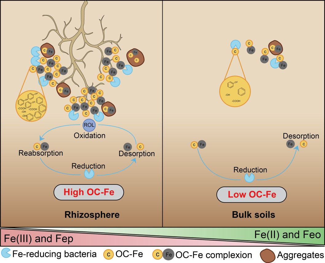 在沼澤濕地植物根際,根系泌氧和根際沉積導致了Fe含量在價態和形態的改變,從而影響了鐵環原菌在根際微域的分布。根際的鐵碳耦合關系相比于非根際更有利于OC-Fe的形成和積累,從而提高OC的穩定性。