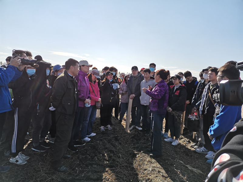 測產(chǎn)之前,李艷華為前來實習(xí)的黑龍江大學(xué)學(xué)生現(xiàn)場講解了測產(chǎn)原理和意義。