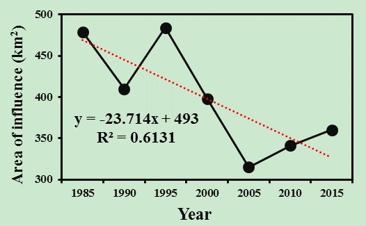 圖3 1986至2016年的周邊地區(qū)受到濕地影響范圍變化趨勢