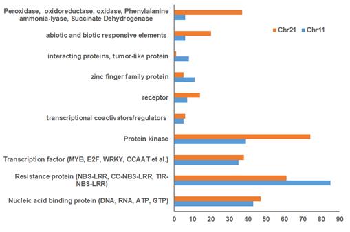 圖2:基于棉花Unigene數(shù)據(jù)庫對Chr11抗性基因簇和Chr21染色體的同源區(qū)域的應(yīng)激反應(yīng)元件(stress response elements)的比較