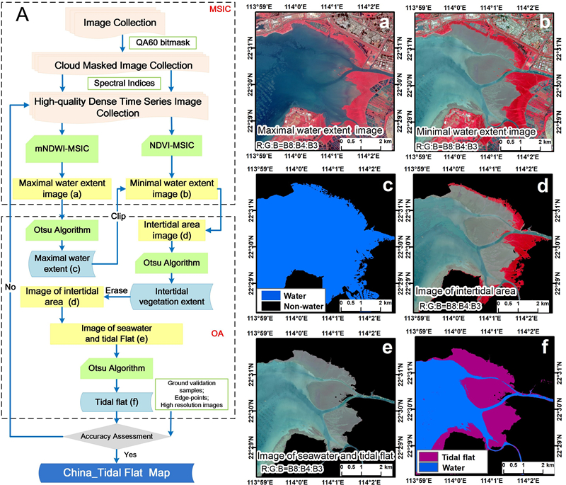 圖1. 基于Sentinel-2密集時間序列影像的MSIC-OA灘涂制圖流程(A),及每步的結(jié)果(a-f)。