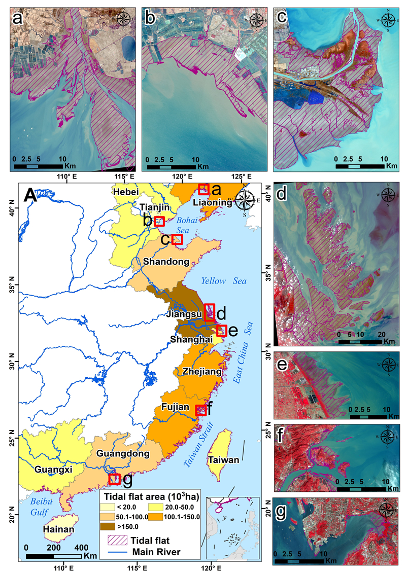 圖2. 中國濱海灘涂空間分布及沿海各省份灘涂面積。