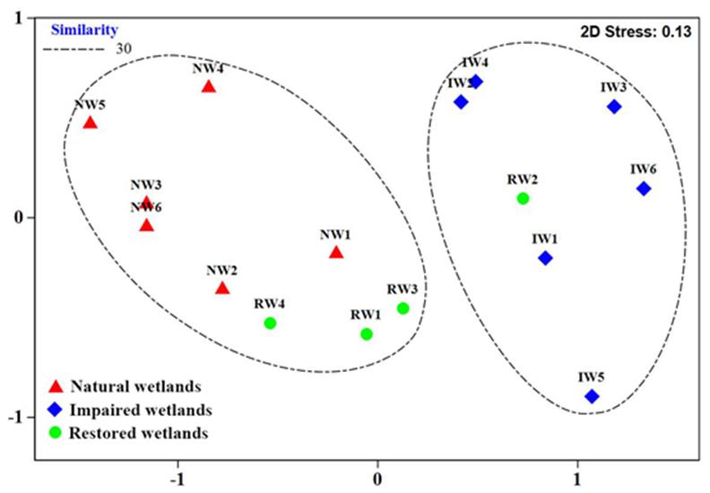 圖1 不同類型濕地水生無脊椎動物群落組成的非度量多維尺度標(biāo)序圖
