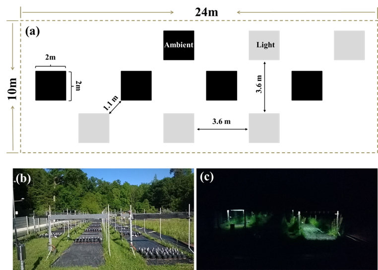 圖一:實驗設置圖解(a)以及光污染平臺白天(b)與夜晚(c)的照片