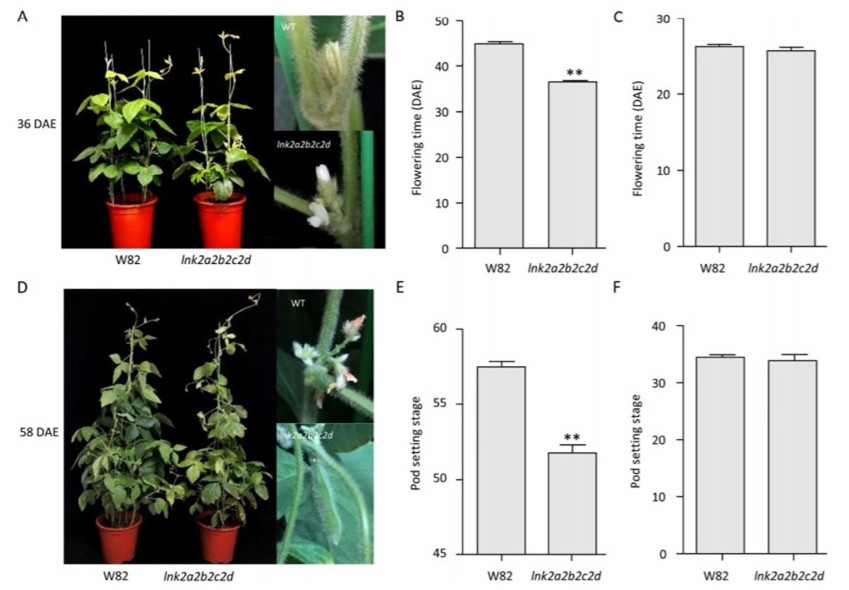 李趙博博士利用全基因組關(guān)聯(lián)分析(Genome-wide association studies, GWAS)技術(shù)與擬南芥重要生物鐘基因進(jìn)行同源比對(duì)的方法,在大豆中鑒定到一調(diào)控開(kāi)花期新基因LNK2 (Night light-inducible and clock-regulated 2)。利用CRISPR/Cas9開(kāi)發(fā)出LNK2基因的轉(zhuǎn)基因四重純合突變體,在長(zhǎng)日照條件下,四重突變體的開(kāi)花時(shí)間明顯早于野生型(圖2)。熒光定量PCR顯示,在長(zhǎng)日照條件下,LNK2的轉(zhuǎn)錄水平明顯低于野生型。LNK2促進(jìn)了豆類特異性E1基因的表達(dá),并抑制了開(kāi)花素FT2a的表達(dá)。這些結(jié)果表明,CRISPR/CAs9介導(dǎo)的4個(gè)LNK2基因的靶向突變縮短了大豆的開(kāi)花時(shí)間。