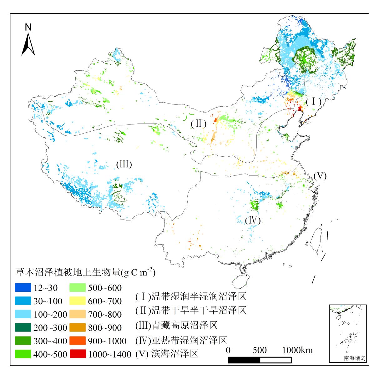 圖2 中國草本沼澤植被地上生物量空間分布格局