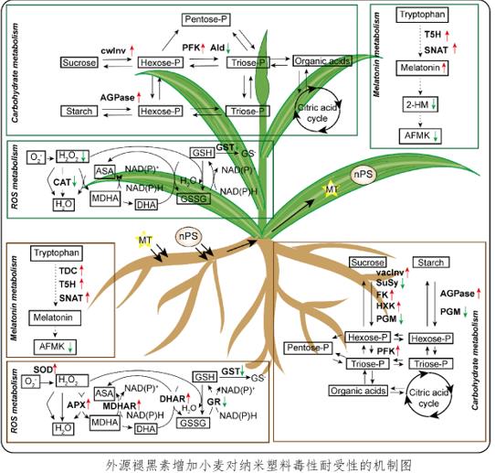 東北地理所作物生理與栽培學(xué)科組研究人員以小麥為研究對(duì)象,針對(duì)褪黑素影響聚苯乙烯納米微粒吸收、轉(zhuǎn)運(yùn)及生理作用進(jìn)行了研究。借助激光共聚焦和掃描電鏡觀察發(fā)現(xiàn),聚苯乙烯納米微粒可以被小麥根系吸收,并且當(dāng)小麥根系暴露于褪黑素和聚苯乙烯納米微粒的混合溶液中時(shí),小麥葉片和根系中聚苯乙烯納米微粒的積累量減少。RT-qPCR分析表明,外源褪黑素能夠調(diào)節(jié)葉片中水通道蛋白相關(guān)基因TIP2-9、PIP2、PIP3和PIP1.2的表達(dá)以及根系中TIP2-9、PIP1-5、PIP2和PIP1.2的表達(dá)。針對(duì)褪黑素處理減少聚苯乙烯納米微粒對(duì)小麥影響的生理機(jī)制,研究人員從內(nèi)源褪黑素代謝、碳水化合物代謝、活性氧代謝等三個(gè)方面對(duì)暴露于聚苯乙烯納米微粒的小麥葉片和根系進(jìn)行進(jìn)一步的分析。結(jié)果表明,施加的外源褪黑素參與小麥植株對(duì)聚苯乙烯納米微粒的響應(yīng),但不依賴于內(nèi)源褪黑素代謝;同時(shí),外源褪黑素施加還可以通過改變多種抗氧化酶活性(包括CAT、GST、APX、MDHAR、DHAR、GR和SOD)維持聚苯乙烯納米微粒造成的氧化脅迫下小麥的氧化還原穩(wěn)態(tài)平衡,并且通過改變碳水化合物代謝水平,保證小麥生長所需的物質(zhì)和能量供應(yīng),從而增強(qiáng)植株對(duì)聚苯乙烯納米微粒毒性的耐受性。