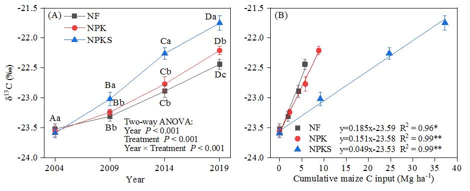 圖2 土壤有機(jī)碳的δ13C值以及δ13C值與累計(jì)玉米碳投入的相關(guān)性