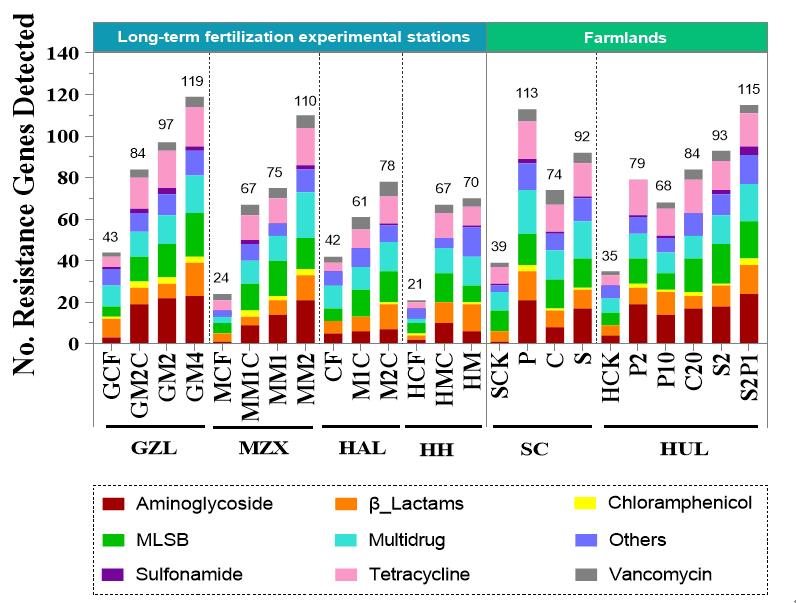 圖1施肥制度對東北黑土農田ARGs數目的影響。樣品采自公主嶺(GZL)、哈爾濱民主鄉(MZX)、海倫(HAL)和黑河(HH)的長期定位施肥試驗,以及雙城(SC)和呼蘭(HUL)的野外農田。GCF、MCF、CF、HCF、SCK 和 HCK 表示不同地點單施化肥對照處理;M表示施用有機肥,MC表示化肥配施有機肥;野外農田中的P、C和S分別代表施用雞糞、牛糞和豬糞;符號后面的阿拉伯數字代表用量(定位試驗)或施用年限(野外農田)