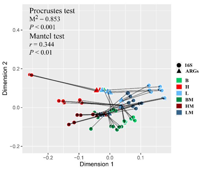 圖2普氏分析(Procrustes)顯示出ARGs組成與細菌群落之間具有顯著的相關性。B、H和L分別代表取自北安(有機質含量高)、海倫(有機質含量中)和梨樹(有機質含量低)的黑土;M表示添加雞糞處理