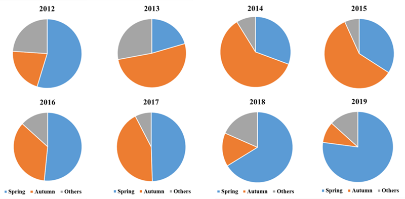 圖1. 2012-2019年東北地區(qū)生物質燃燒在春耕前、秋收后及其他時間的比例