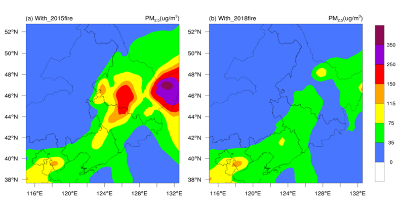 圖 2. 在2015年氣象條件及人為源排放情況下,分別添加2015年(a)和2018年(b)生物質燃燒源排放的污染物PM2.5濃度分布圖