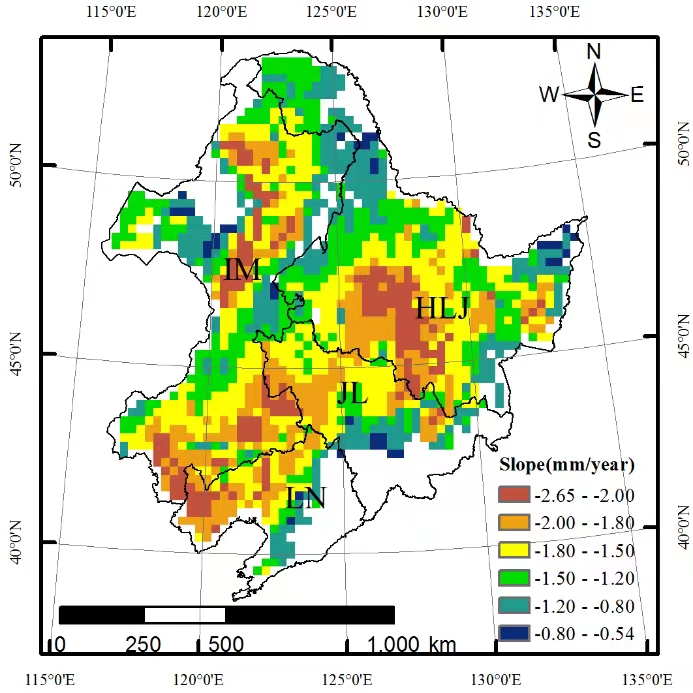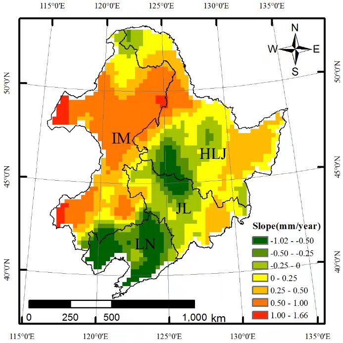 圖1東北地區(qū)玉米根區(qū)0-200 cm深度范圍土壤水分時(shí)間變化率的空間分布特征