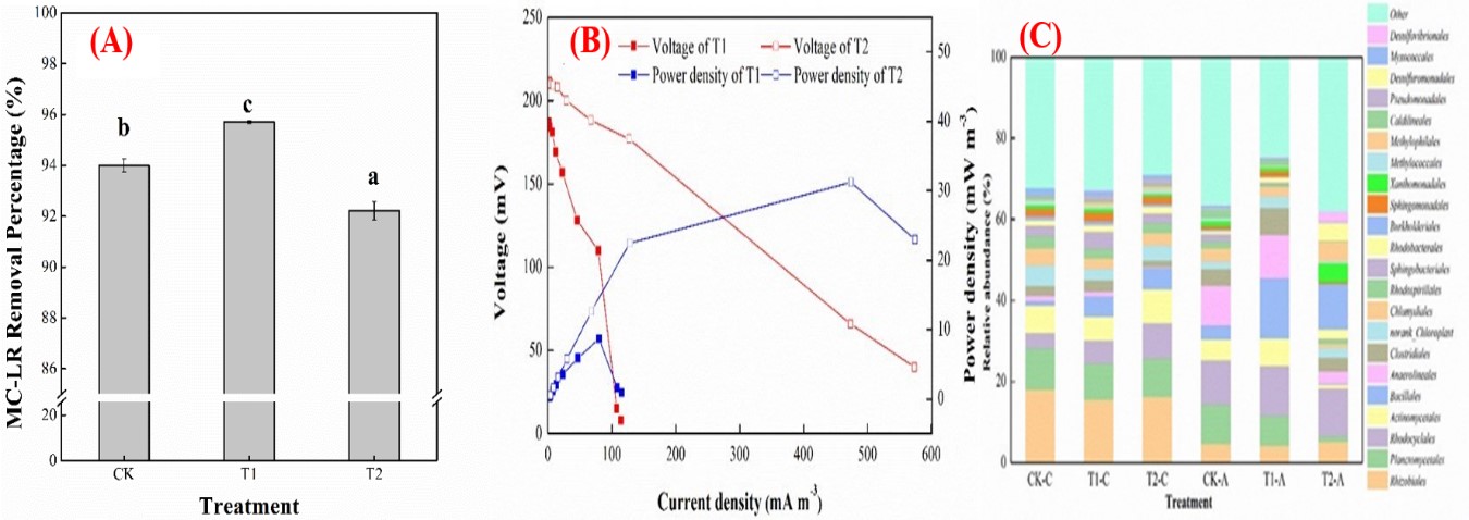 圖1 MFC-CWs對MC-LR的去除效果(A)、系統(tǒng)產(chǎn)電性能(B)與微生物群落結(jié)構(gòu)(C)