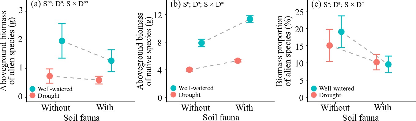 研究發現:干旱降低了外來植物的絕對生物量和生物量占比(圖2、3),從而降低了外來植物在本地群落中的競爭力。此外,干旱也降低了中型土壤動物的多度,尤其是螨類的多度,但對土壤食草動物的多度和豐富度沒有影響(圖4)。接種中型土壤動物不影響外來植物的生物量,但增加了本地植物的生物量,從而降低了外來植物的生物量占比(圖2、3)。然而,與干旱處理相比,水分充足條件下,接種中型土壤動物增強了本地植物對外來植物入侵的抗性(圖2、3)。本研究揭示干旱有助于本地植物群落抵御外來植物入侵,但中型土壤動物的存在則減弱了這一抵抗力。
