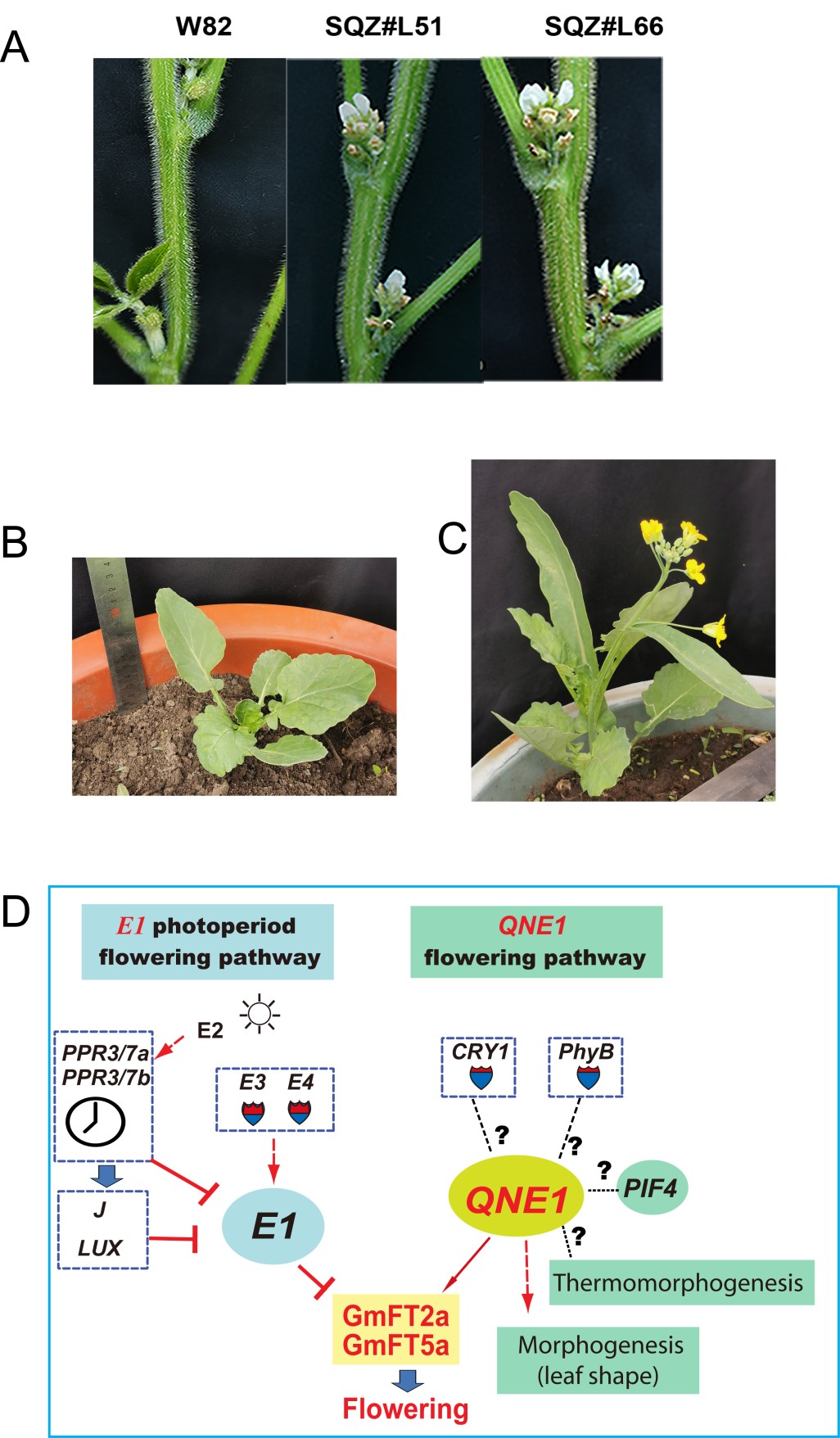 A:過表達Qne1大豆呈早花表型。W82:野生型Williams 82品種; SQZ#L51與SQZ#L66, 為過表達Qne1 植株。 B-C, 過表達Qne1油菜促進開花與引致葉形態變化。B:野生型油菜品種K407, C:過表達Qne1油菜植株。D:Qne1功能的模型圖。 與日照時長密切相關的E1光周期開花通路相比,Qne1通路調控植物開花不受光周期所調控。同時Qne1 還調控植物葉片形態。