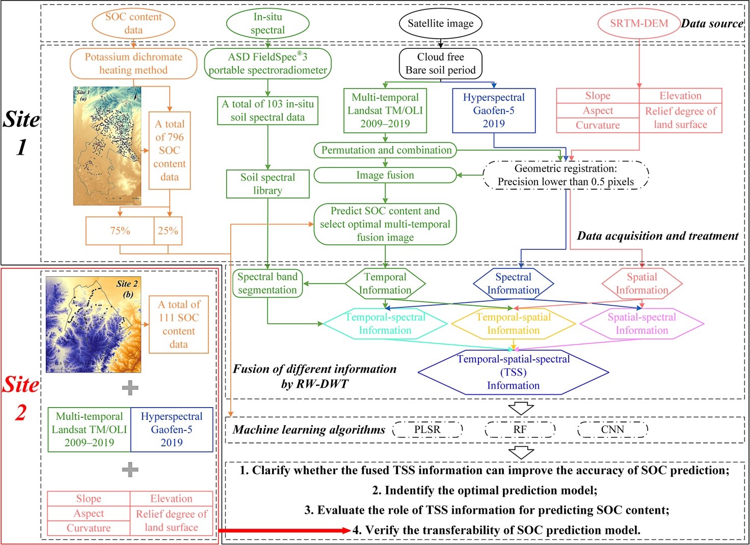 在全球碳循環中,土壤有機碳(SOC)是最大的陸地碳庫,約占陸地總碳的50-80%,其含量是大氣或植被的三倍以上,并決定了景觀的碳源、碳匯能力。了解土壤有機碳含量對環境可持續性和碳中和至關重要。隨著遙感數據和預測模型的發展,融合多源遙感數據預測SOC含量是一個有趣而富有挑戰性的課題。為此,中國科學院東北地理與農業生態研究所農業遙感學科組的科研人員基于區域能量權重的離散小波變換和譜帶分割方法,融合了2009-2019年10個場景的陸地衛星多光譜圖像數據的時相信息、地形數據的空間信息和高分5號高光譜圖像的光譜信息。然后,利用偏最小二乘回歸、隨機森林和卷積神經網絡算法,開發一種提取時-空-譜(TSS)融合信息的新方法,驗證TSS信息是否能夠更好地代表土壤信息,提高土壤有機碳含量預測的準確性,并驗證模型的可移植性,評估時相、空間和光譜信息在預測SOC含量中的作用。