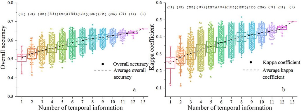 圖2 不同時(shí)相信息數(shù)量的總體精度和kappa系數(shù)。箱線(xiàn)圖上方括號(hào)中的數(shù)字表示多時(shí)相多光譜數(shù)據(jù)中不同多光譜圖像組合的數(shù)量。