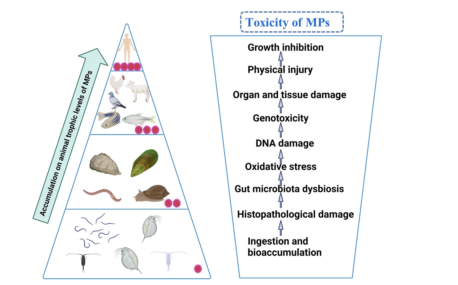 圖3 微塑料在動(dòng)物不同營養(yǎng)級(jí)水平上的轉(zhuǎn)運(yùn)和毒性