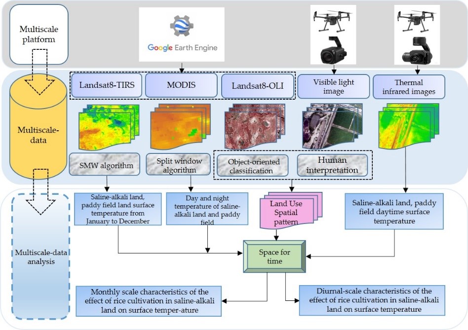因此,本研究以吉林省西部大安市為研究區(qū),利用1km MODIS產(chǎn)品、30m Landsat 8衛(wèi)星圖像和厘米級(jí)無人機(jī)圖像,獲得了鹽堿地和水田地表溫度的多尺度數(shù)據(jù),分析了鹽堿地和水田在一年中不同月份和一天中不同時(shí)間的地表溫度變化特征。并采用“空間代時(shí)間”的方法評(píng)估了鹽堿地種稻對(duì)局地地表溫度的影響。基于衛(wèi)星觀測(cè)的結(jié)果表明,在作物生長季,鹽堿地地表溫度顯著高于稻田,尤其是在生長季中期的7月和8月;鹽堿地種稻的降溫效應(yīng)主要集中在白天而非夜晚;基于無人機(jī)熱紅外觀測(cè)結(jié)果進(jìn)一步證實(shí)了這一結(jié)論。